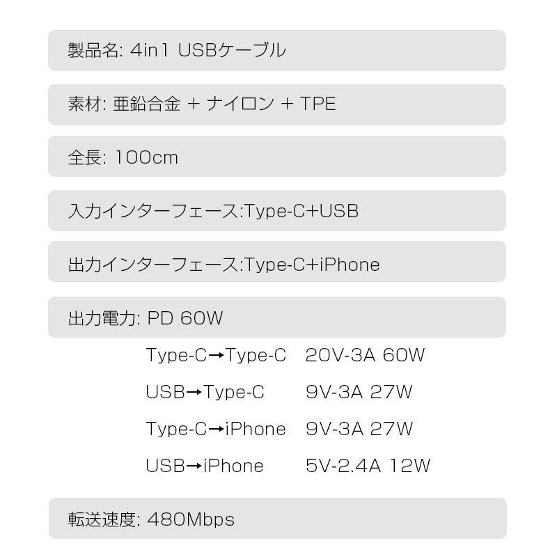【2025最新】4in1ケーブル Type-C to Type-Cケーブル USB充電ケーブル iPhone16e 充電ケーブル 1m 充電コード Type-C / iPhone / USB-A 急速充電対応 PD規格 マルチケーブル 断線に強い 最大PD60W 時短充電 USB2.0 データ転送 480Mbps データ伝送 ナイロン編み iOS Android