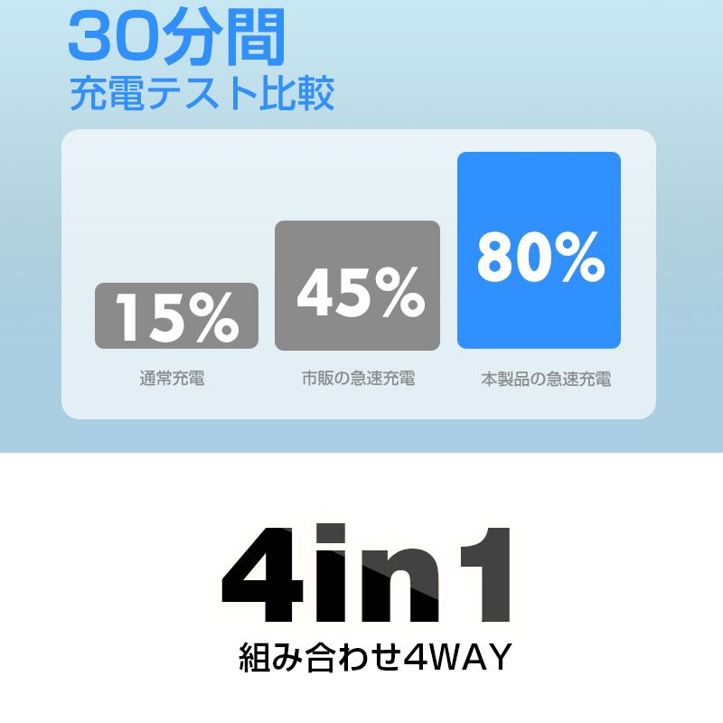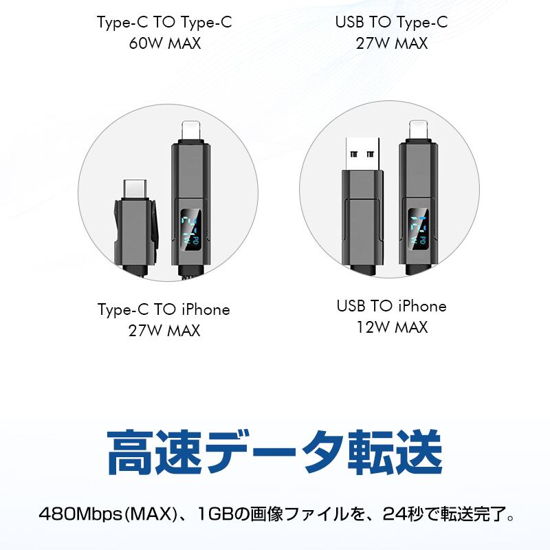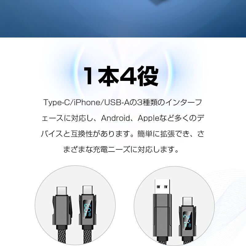 デバイスに合わせてコネクターを付け替えられる4in1 USBケーブルです。「USB-A to iPhone」「USB-A to Type-C」「Type-C to iPhone」「Type-C to Type-C」の4パターンで活躍がします。幅広い互換性で、iPhone・Android・モバイルバッテリーなどの様々な機器に対応し、これ1本で、様々なデバイスの充電やデータ転送の需要を満たします。複数のケーブルを用意する煩わしさを解消できます。