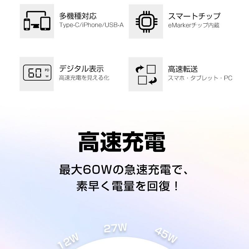 USB PD(PowerDelivery)に対応し、最大60W(20V/3A)の大電流を送電可能です。例えば、従来使われているモバイルバッテリーや充電器の電力が5W程度ですので、約12倍の電力を供給できることになったのです。充電時間の短縮が可能です。※ご使用になるパソコンやAC充電器などの性能によって、供給される電流値が異なります、ご了承ください。
