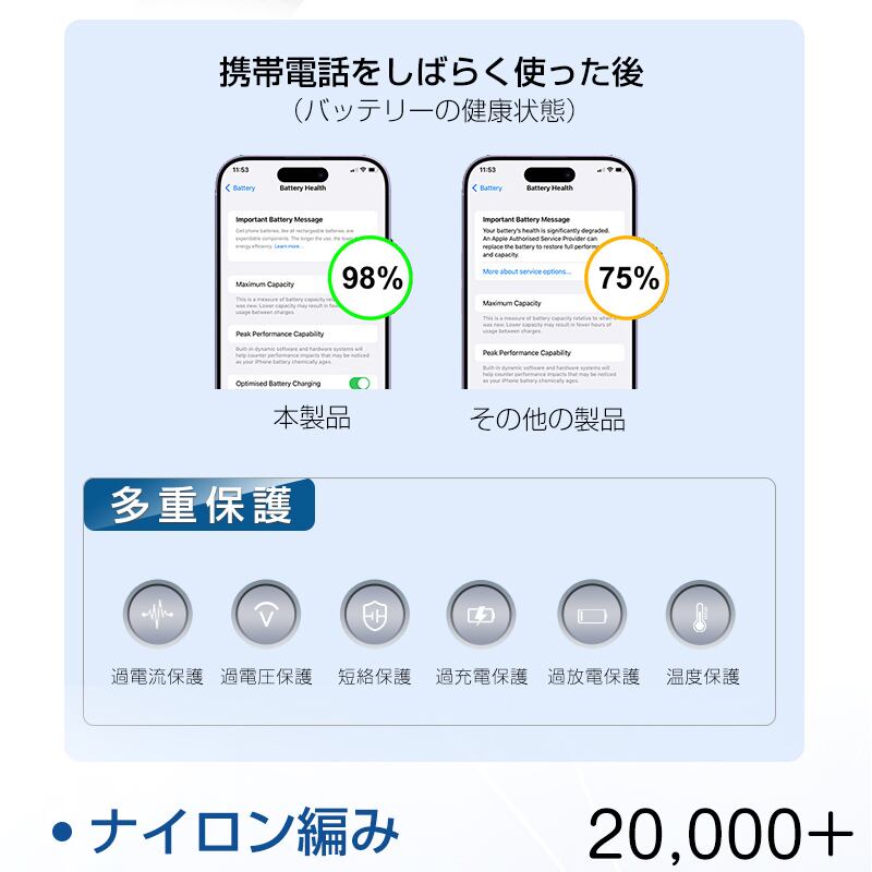 耐挿抜の合金コネクタを採用しており、繰り返しの差し込みと抜き出しや保管にも耐えられるほど強力です。強靭なナイロン編み製ケーブル被覆なので断線を防ぎ、長期間安全に充電をすることができます。一本だけ、全ての充電要求をを満たします。ナイロン編みの被覆がツルツルで、絡まりにくくて、収納も持ち運びにも便利です。