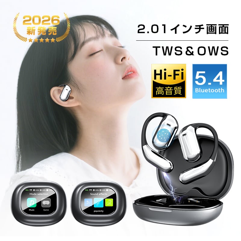 【2026最新型 タッチパネル搭載】 空気伝導イヤホン Bluetooth5.4 液晶付き 2.01インチ イヤホン 周囲の音が聞こえる ながら聴き 耳掛け型 ワイヤレスヘッドセット TWS&OWS オープンイヤー 快適 タッチスクリーン 自動ペア Hi-Fi高音質 マイク内蔵 ENCノイズキャンセリング