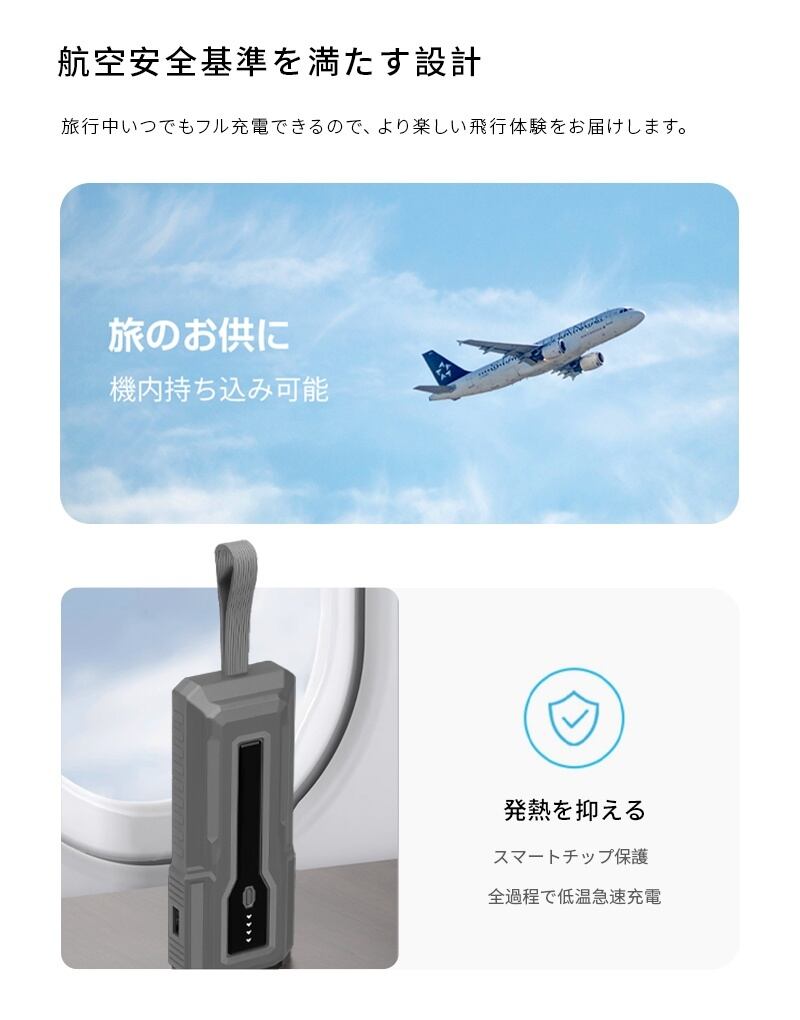 2.コンパクト:大容量15,000mAhを備えながら、ポケットに入るほどコンパクトなサイズ。