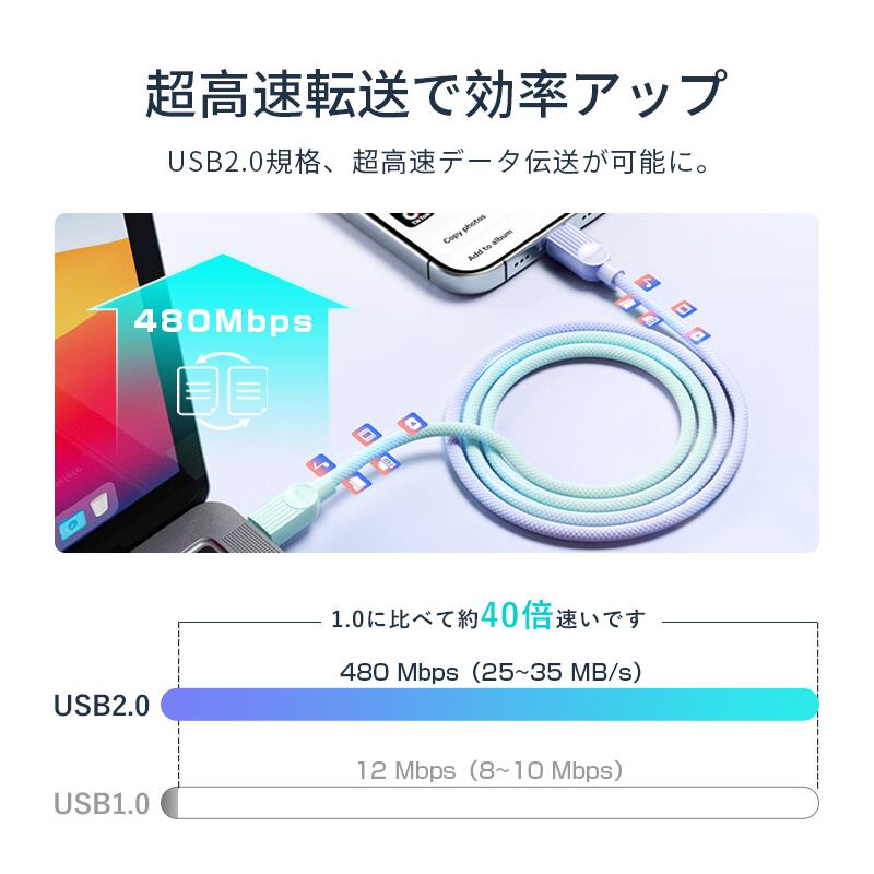 接続部が強化されており、耐挿抜の亜鉛合金コネクタを採用しており、折れ曲げに強く、断線しにくい、繰り返しの差し込みと抜き出しにも耐えられるほど強力です。高品質TPEとナイロン編み被覆材により、柔軟性が良く耐久性も抜群です。表面がツルツルで、取り回しやすく、絡まりを防ぎます。芯には、厳選したワイヤー使用、大きな電力に耐えられ、長期間安全に充電することができます。