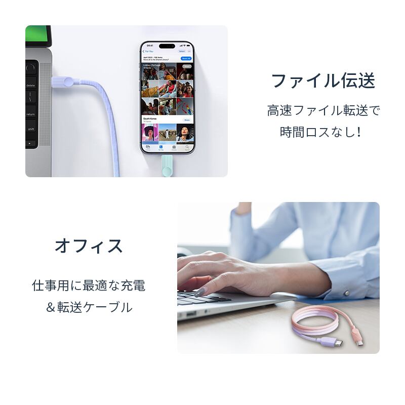 0.5m/1m/1.5mの長さは、オフィスでの充電やデータ転送に使いやすい長さです。ぐちゃぐちゃにならず、デスクが整然と維持できます。