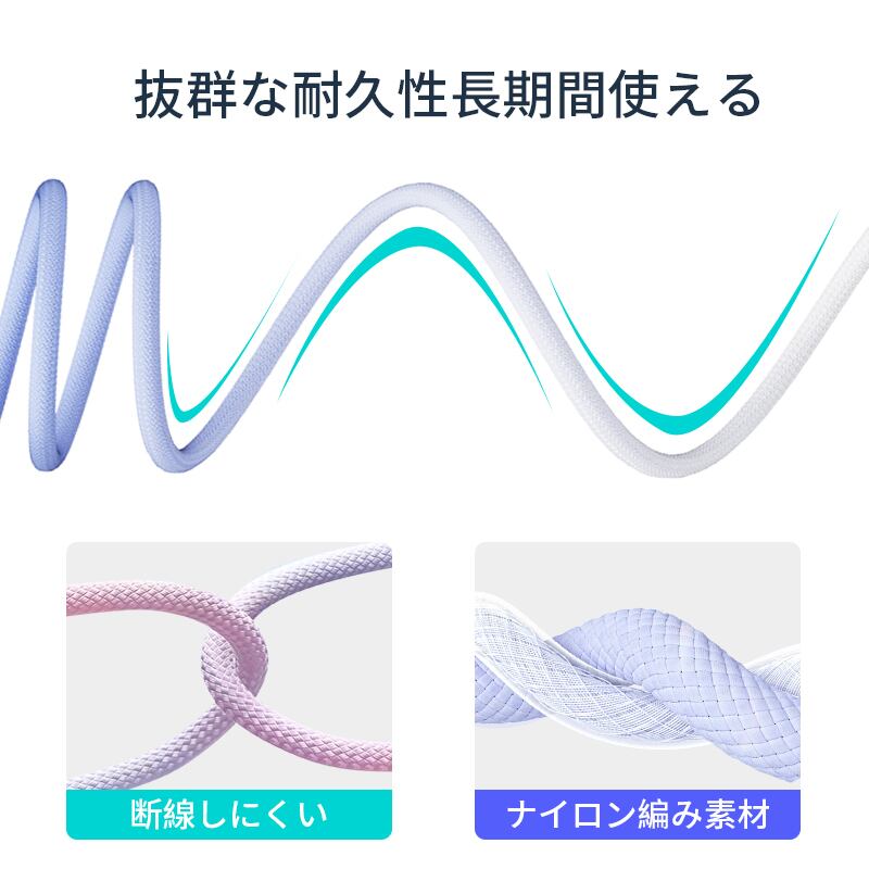 接続部が強化されており、耐挿抜の亜鉛合金コネクタを採用しており、折れ曲げに強く、断線しにくい、繰り返しの差し込みと抜き出しにも耐えられるほど強力です。高品質TPEとナイロン編み被覆材により、柔軟性が良く耐久性も抜群です。表面がツルツルで、取り回しやすく、絡まりを防ぎます。芯には、厳選したワイヤー使用、大きな電力に耐えられ、長期間安全に充電することができます。