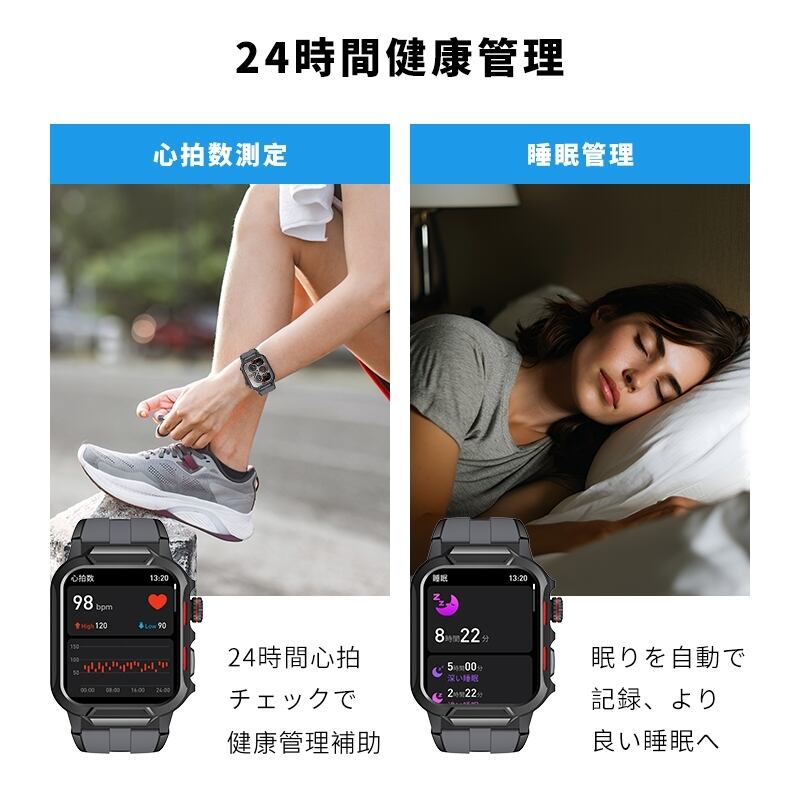 着信やメール、SMS、SNS、アプリなどの通知を即時に表示する機能付き、重要なメッセージを見逃しません。また、本体には、スピーカーが搭載、着信通知だけではなく、Bluetooth通話も対応します、スマホを取り出さず、ウォッチで通話可能です。更に、Bluetooth接続すると音楽再生/一時停止/曲切り替えなどの機能がウォッチ本体で操作できます。