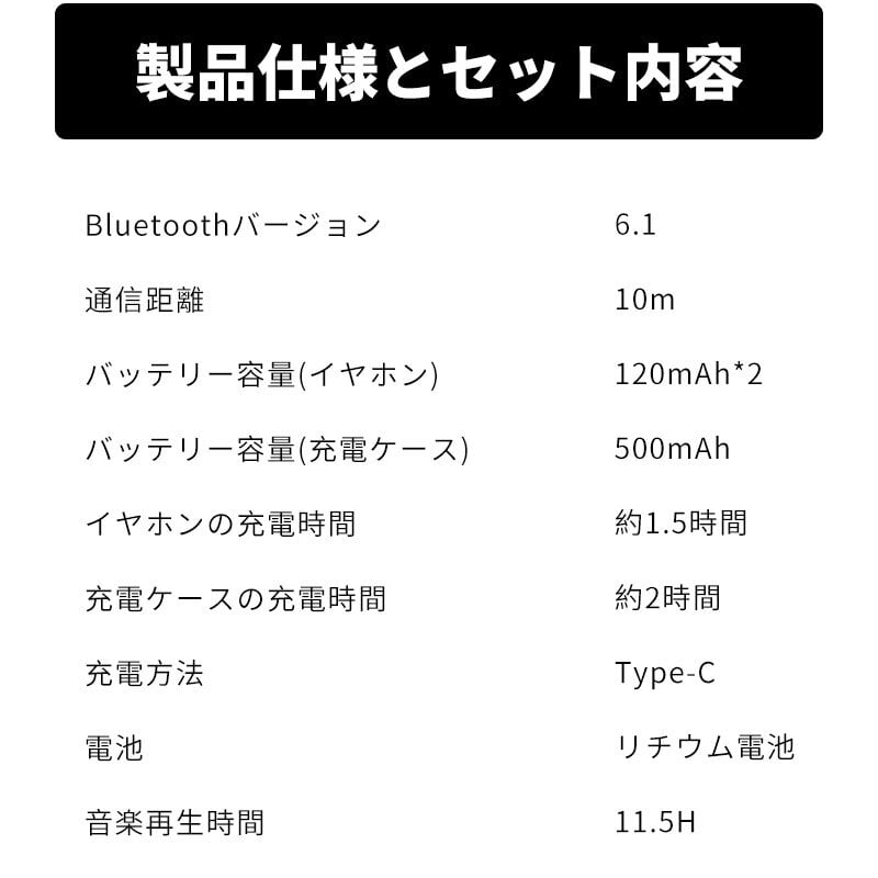 パッケージリスト:イヤホン本体/充電ケース/Type-C充電ケーブル/日本語取扱説明書