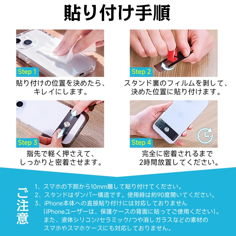 スタンド底部には強化された支えプレートとダブルスプリングバネクランプを採用し、スマートフォンを安定して支えます。タッチ操作時でもグラつきにくく、確かな支えを実現しました。スタンドの底板には強力な粘着テープが装着されており、スマートフォンの背面下部から10mmの位置に貼り付けることで、最適なバランスで固定できます。幅広の支えプレートにより、縦向き・横向きどちらの使用状況でも安定性を確保しています。