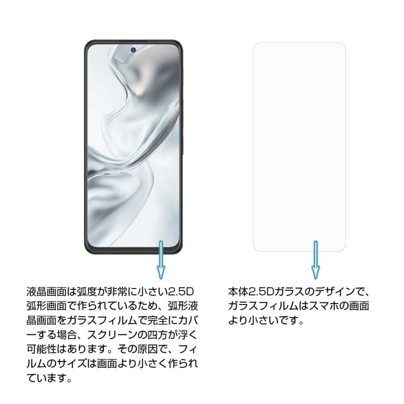 液晶画面は弧度が非常に小さい2.5D弧形画面で作られているため、弧形液晶画面をガラスフィルムで完全にカバーする場合、スクリーンの四方が浮く可能性はあります。その原因で、フィルムのサイズは画面より小さく作られています。予めご了承ください。