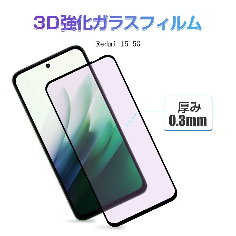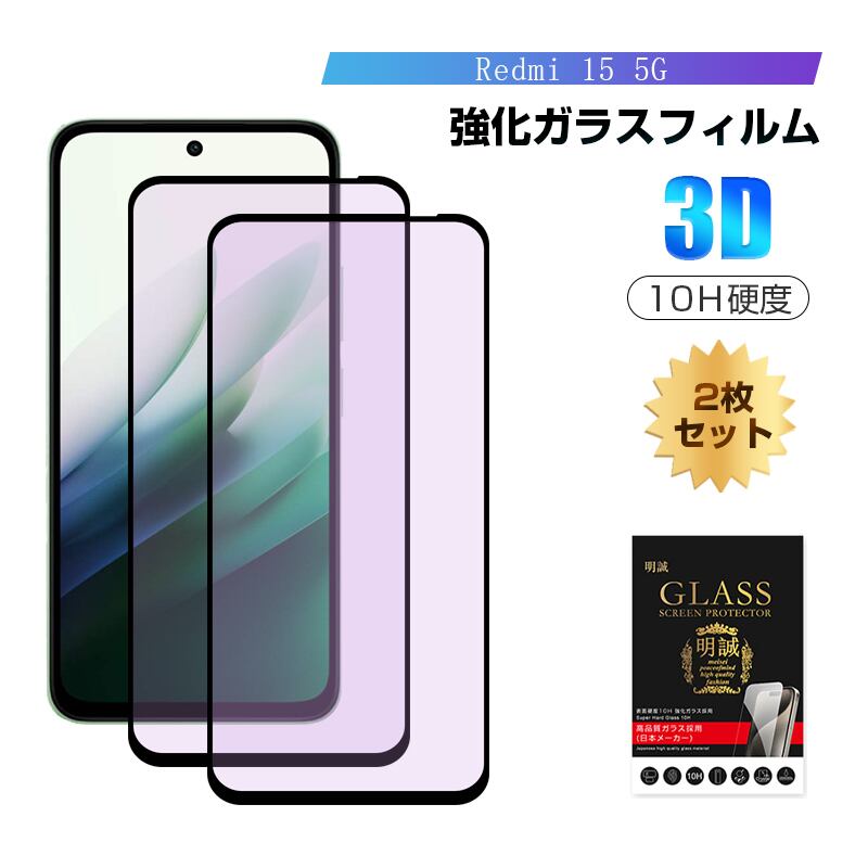【2枚セット】 Redmi 15 5G ガラスフィルム ブルーライトカット 強化ガラス スマホ画面保護 フィルム スクリーン保護フィルム 目を守る A501XM 液晶保護 25057RN09R 耐衝撃 レッドミ・フィフティーン・ファイブジー スクラッチ防止 ディスプレイ保護シール 3D 全面保護
