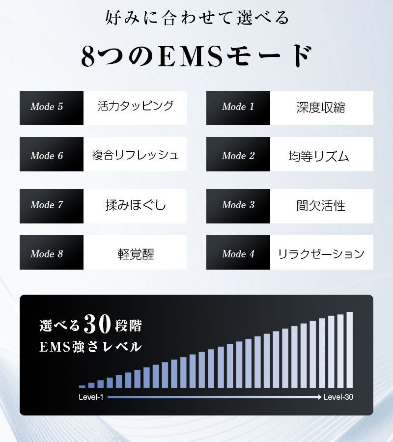本製品は、筋肉に低周波の微弱電流(0〜30mA)を送るEMS(電気筋肉刺激)技術を採用しています。8種類のプリセットモードと1〜30段階の強度調節により、ユーザーの好みや部位に合わせて最適なトレーニングが可能です。週3回、1回30分の使用で、従来の1時間の筋トレに相当する効果が期待でき、忙しい現代人にとって理想的な「ながらトレーニング」を実現します。
