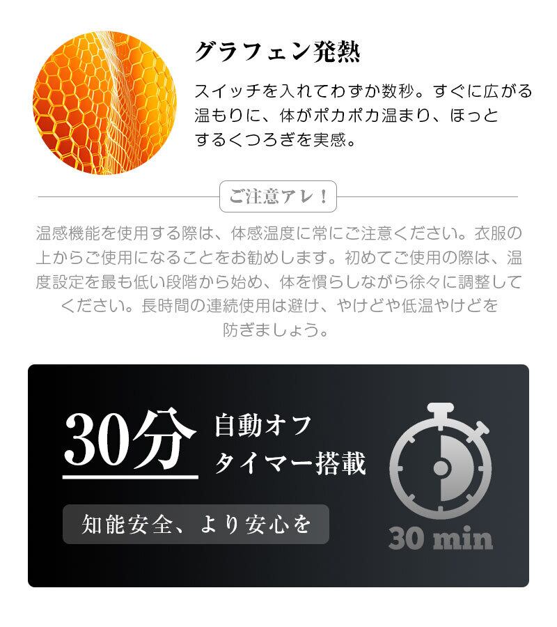 すべての部材は安全性が考慮されたものを使用。1回の使用は最大30分で自動停止。電流は厳密に管理され、皮膚への刺激は安全な範囲に収められています。発熱も低温やけどが起こらない適温に制御。さらに、使用時には必ず電極部分が肌に直接密着するよう注意喚起を行うなど、安心してご利用いただける設計です。