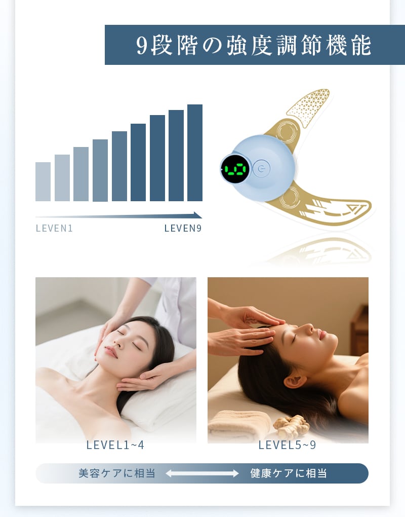 初心者から上級者まで、ご自身の肌感覚や耐性に合わせて、1〜9段階で刺激強度を細かく調整可能。使用中も短押しで簡単に切り替えられます。肌の状態や目的に応じて、最適な強度で無理なくケアを続けられるため、継続的な使用と効果の持続が期待できます。