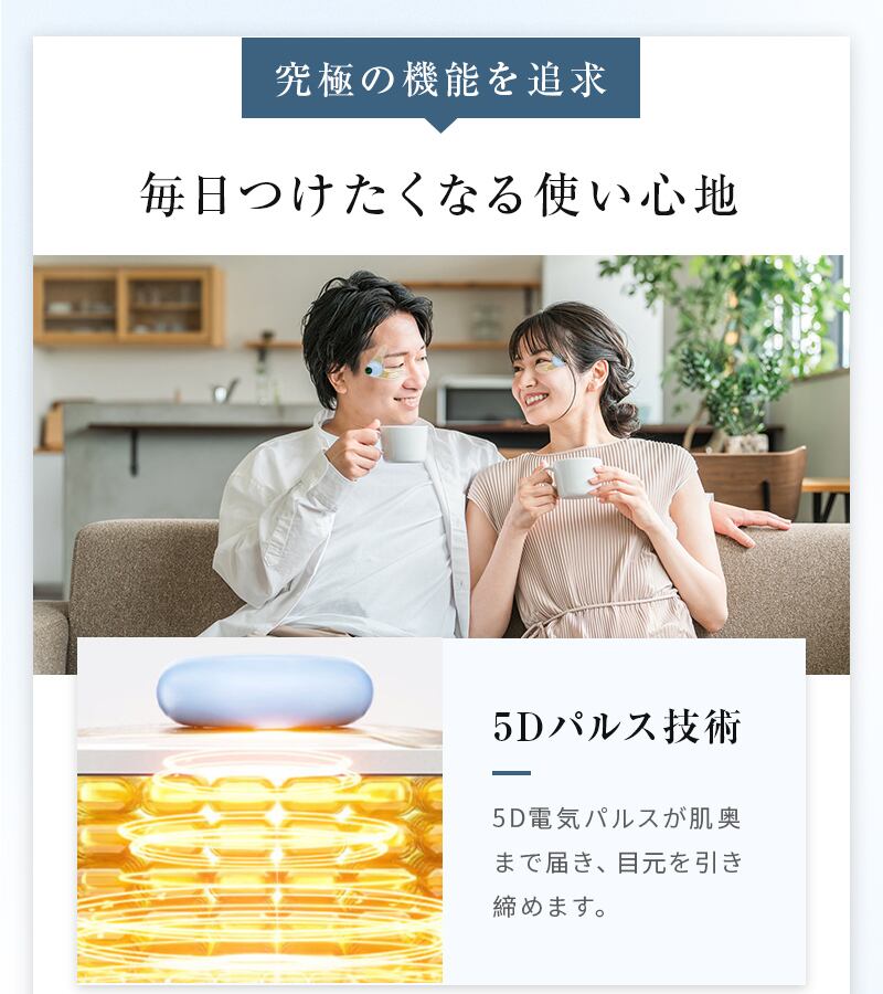 従来のエッセンスや美容液が主に表皮層に留まるのに対し、本製品はEMSパルスを眼輪筋(目の周りの筋肉)に直接伝導します。5Dパルスと呼ばれる独自の波形で、筋肉を優しく収縮・刺激し、筋力向上を促します。