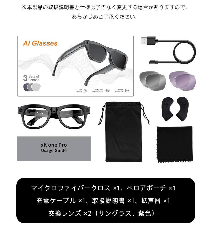 本品のスマートグラスは、3種類の交換可能レンズ(透明レンズ・サングラスレンズ・ブルーライトカットレンズ)を同梱。シーンや目的に応じてカスタマイズでき、1台で多彩な役割を果たします。