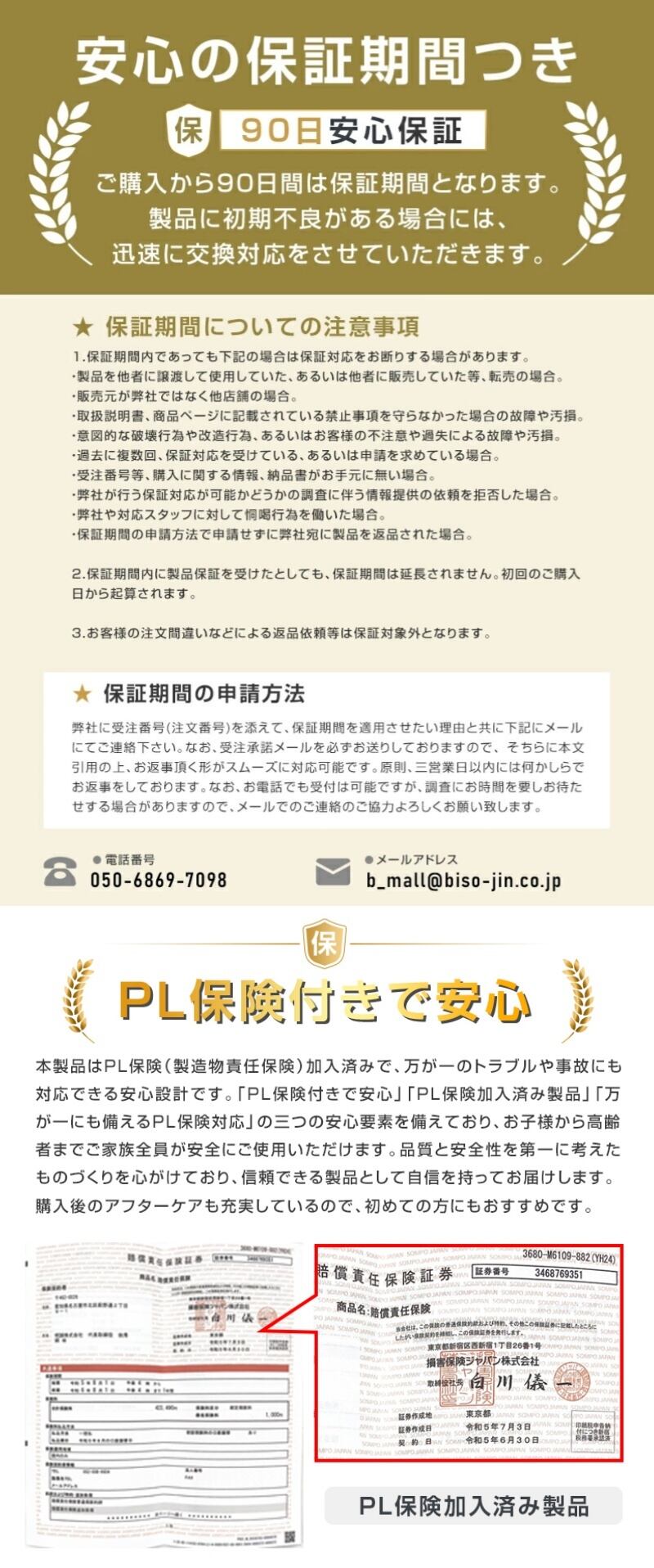 本製品はPL保険(製造物責任保険)加入済みで、万が一のトラブルや事故にも対応できる安心設計です。「PL保険付きで安心」「PL保険加入済み製品」「万が一にも備えるPL保険対応」の三つの安心要素を備えており、お子様から高齢者までご家族全員が安全にご使用いただけます。品質と安全性を第一に考えたものづくりを心がけており、信頼できる製品として自信を持ってお届けします。購入後のアフターケアも充実しているので、初めての方にもおすすめです。