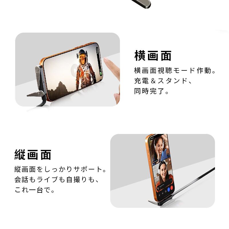 ケーブル本体に超小型の多角度調整可能な折りたたみスタンドを一体化。アルミ合金素材を採用し、軽量かつ高剛性を両立しています。縦向き・横向きの自由な角度調節が可能で、動画視聴やビデオ通話はもちろん、ゲームプレイ中の安定した置き使用にも最適です。使用しない時はすっきり折りたためるため、収納・携帯性を損ないません。