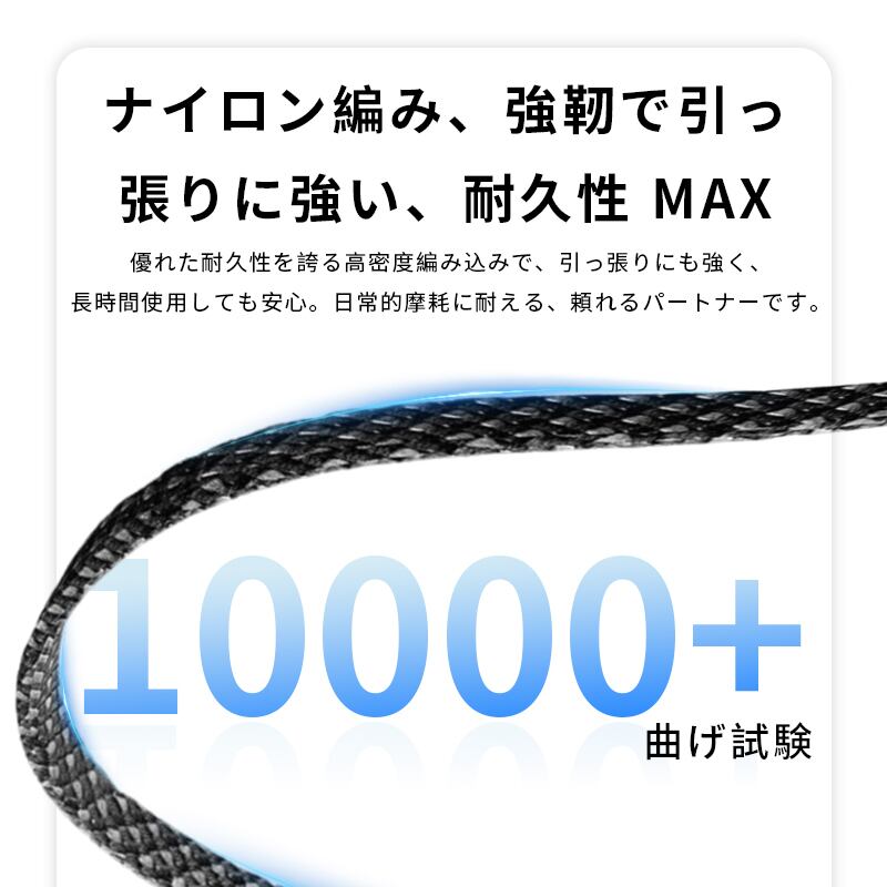 外層には高強度の耐久性に優れたナイロン編みを採用。表面がツルツルで絡まりにくく、引き裂きや日常的な引っ張りに強く、長期的な使用における断線リスクを大幅に低減します。特に接続部分には「高靭性・折れ防止設計」を施し、繰り返しの屈曲に耐える強化構造により、使用寿命を延ばしています。更に、結束バンド付き、ケーブルをスッキリと収まり、カバンの中に入れてもかさばらず、携帯便利です。