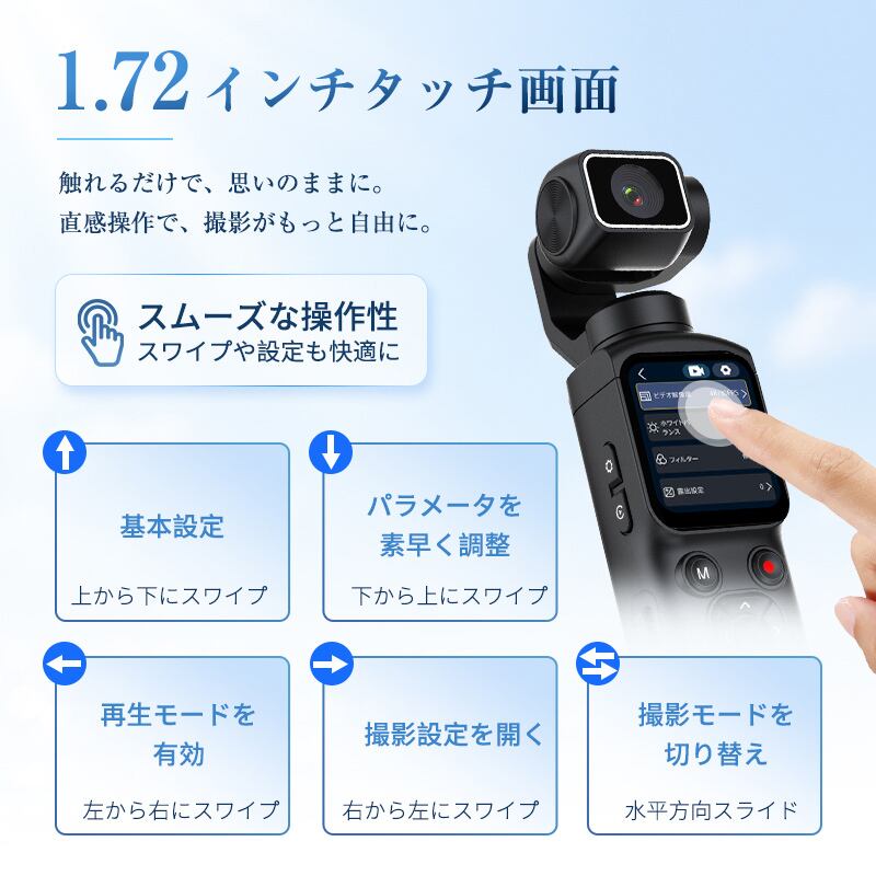 1.72インチの大型タッチスクリーンで、直感的に設定変更や再生が可能。さらに、Bluetooth6.1搭載、Wi-Fi/OTG転送に対応しており、撮影した映像や写真をすぐにスマートフォンへ転送し、SNSでシェアすることができます。面倒なケーブル接続は不要です。