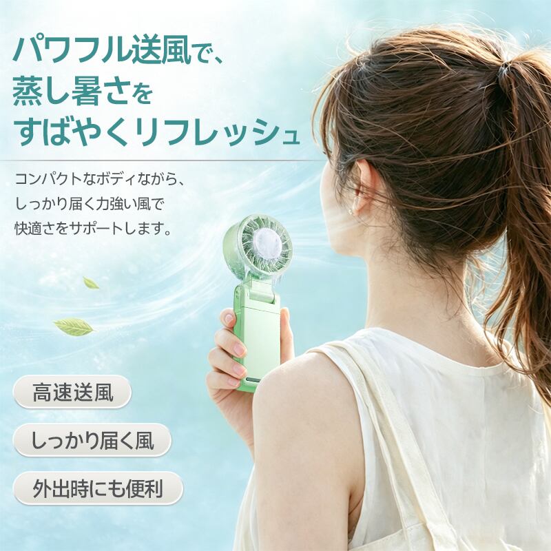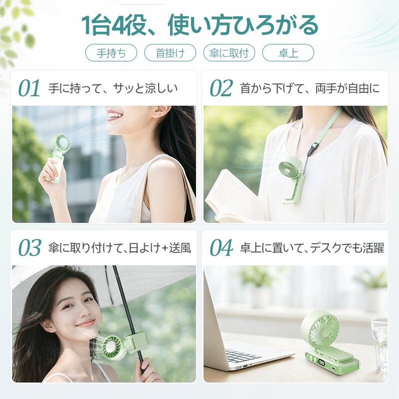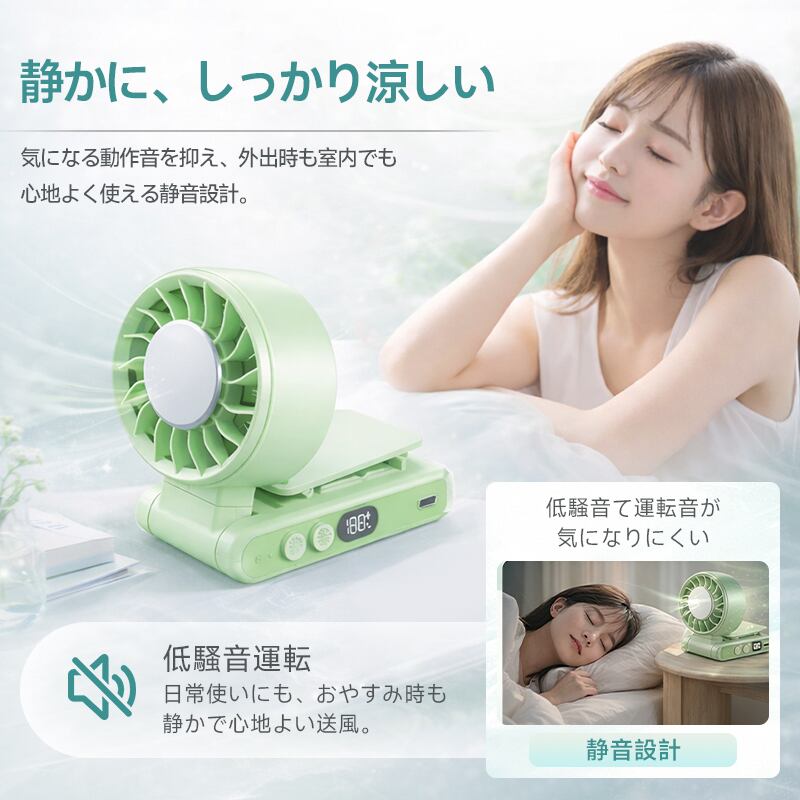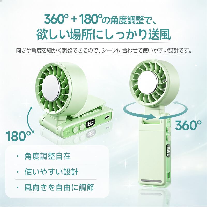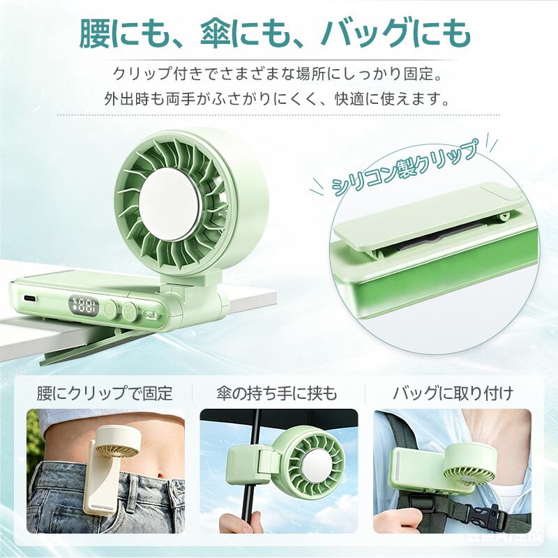 扇風機の向きは、360°の水平回転+180°の垂直(上下)可動という独自のダブル回転構造を採用。これにより、腰に付けても、傘に取り付けても、デスクに置いても、自分に最適な角度へ簡単に調整できます。首振り機能こそないものの、この柔軟な可動域が、あらゆるシーンでの快適な風使いを実現しています。