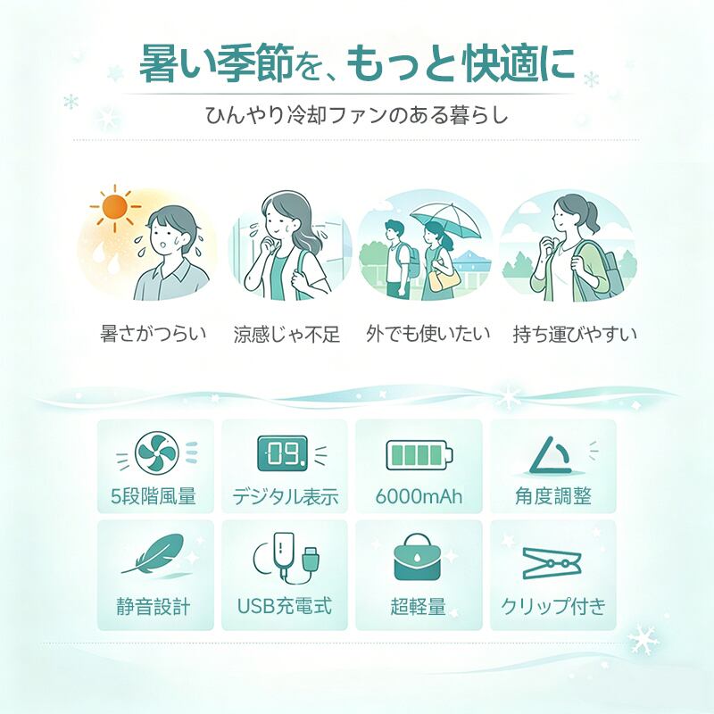 ポータブルファン ハンディファン 冷却ファン 首かけファン ウェストファン クラッチファン 折りたたみファン デスクファン 強力ファン 高速ファン 冷風ファン ペルチェファン 氷感ファン 冷却プレート 瞬間冷却 TECファン 扇風機 携帯扇風機 小型扇風機 155g 軽量ファン 6000mAh 大容量バッテリー 長時間動作 Type-C充電 急速充電 充電式 USB扇風機 バッテリー内蔵 風量調整 5段階風量 無段階調整 デジタル表示 LED残量表示 静音設計 静か 睡眠用 パワフル 強風 送風 首振りじゃない 360度回転 180°角度調整 多角度 折りたたみ式 折りたたみスタンド 卓上 手持ち ハンズフリー 傘クリップ 傘挟み クランプ式 クリップ式 ベルト通し 腰掛け ウェストマウント 作業用 アウトドア キャンプ 野外作業 スポーツ観戦 通勤 電車内 登山 釣り ガーデニング イベント 暑さ対策 熱中症対策 夏グッズ 夏準備 冷却グッズ ギフト プレゼント おしゃれ コンパクト 携帯性 持ち運び 便利 多機能 一台四役 高品質 PC+ABS 耐久性 日本語説明書 保証付き 2026年モデル 新商品 人気 信頼性 品質保証 ギフト プレゼント 贈り物 実用的な贈り物 新生活 一人暮らし 引っ越し準備 入学準備 就職祝い 父の日 母の日 母の日ギフト 父の日ギフト 誕生日プレゼント お返し 便利グッズ あったら便利 日用品 家電 スマート家電 デジタルアクセサリー ガジェット 買い替え お祝い 新生活応援 全国一律送料無料
