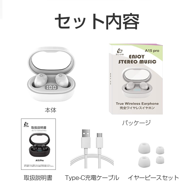【パッケージリスト】ヤホン本体、Type-C充電ケーブル、イヤピースセット、日本語取扱説明書。