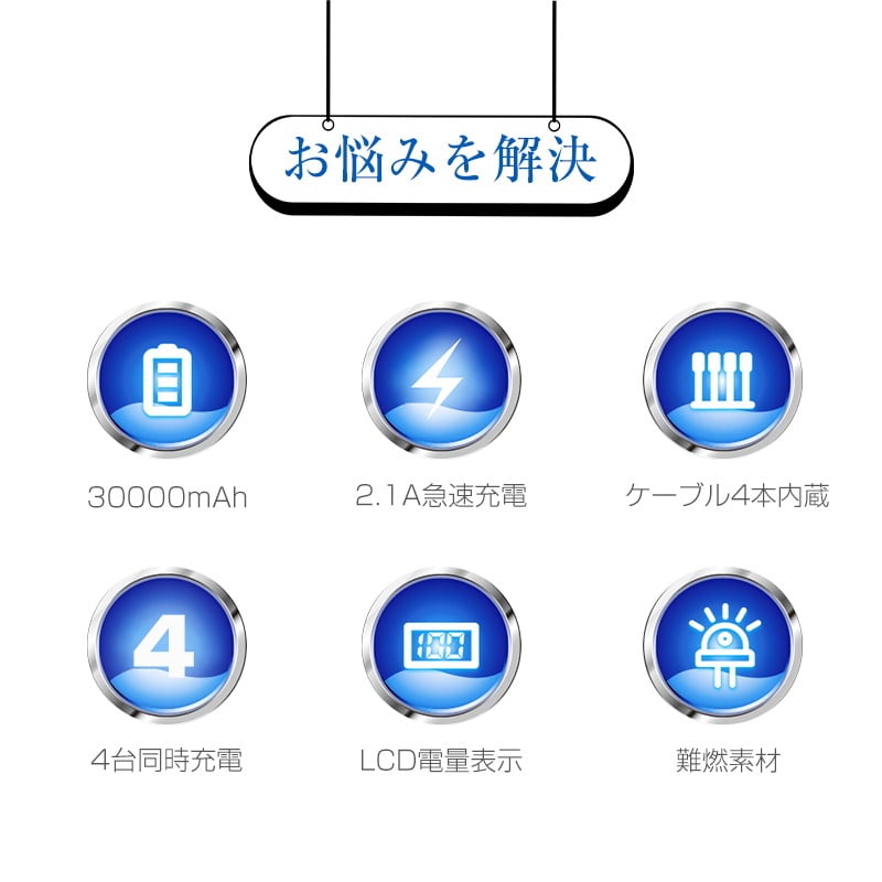 モバイルバッテリー 大容量 30000mAh 防災電源 4本ケーブル内蔵 完全ケーブル不要型 USB-A入力ケーブル搭載 Type-C出力/入力 Micro 入力/出力 iPhone出力 4台同時充電 2.1A 急速充電 パワーバンク 互換性抜群 デジタル残電量表示 多機種対応 持ち運び便利 携帯電話充電 イヤホン/ゲーム機/スマートウォッチ充電 自動検知機能 安定出力 時短充電 安全保護機能搭載 出張 旅行 地震 災害 緊急用 PSE認証済み 90日あんしん保証付き 日本語取扱説明書 | meisei-shop