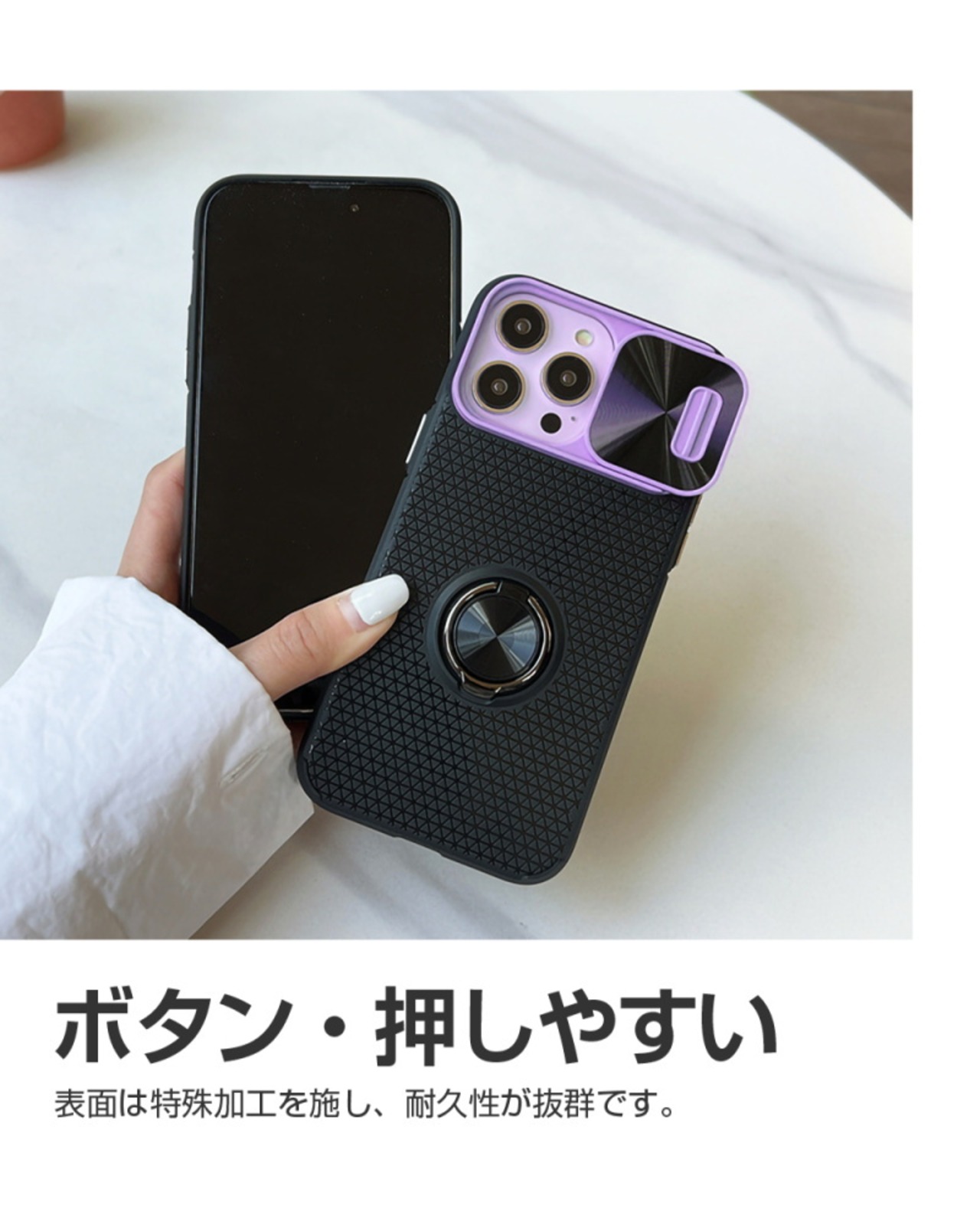 ケース本体には、高品質なTPUを採用し、やわらかいソフトケースなので、スマホを取り外しやすく手にもしっかりフィットします!表面にシンプルな模様を施し、滑り止めになるだけではなく、質感もアップします。(*スライドカバーはPC製です。)
