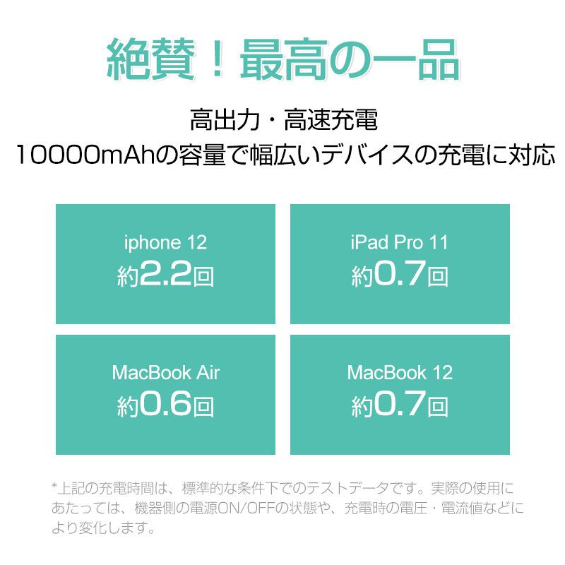 10000mAhの大容量バッテリーが搭載されて、スマホに約2回フル充電可能です。ちょっとしたお出かけや旅行、通勤、出張などにスマホやタブレットの電池切れに悩むことはありません。最大22.5W出力が可能で従来の5W出力の充電器に比べ充電時間を短縮できます。