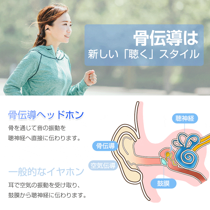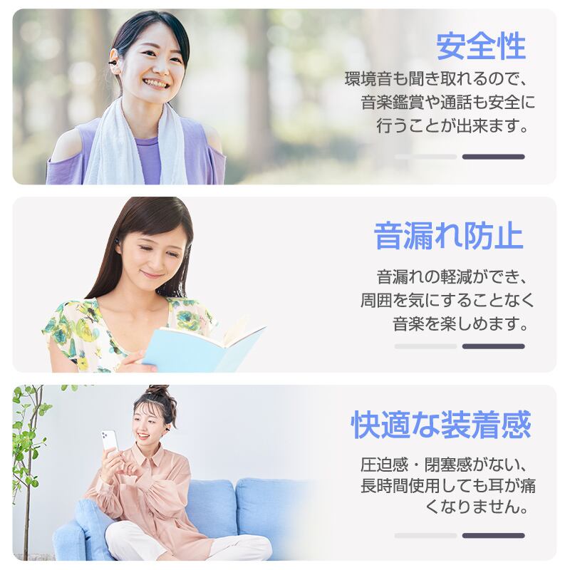 どんな耳の形にもフィットするイヤーカフ構造の骨伝導イヤホンは、一般の耳かけ式と違って、耳介に挟むように装着します。イヤホンが入りにくい耳穴でも問題なし!骨伝導イヤホンは耳をふさがないので、テレワーク・スポーツ・移動中など、全ての場面でながら聴きしながら作業可能です。また、左右完全分離に進化しました。煩わしいネックバンドなどを気にすることなくどんなヘアスタイルでも快適に装着いただけます。