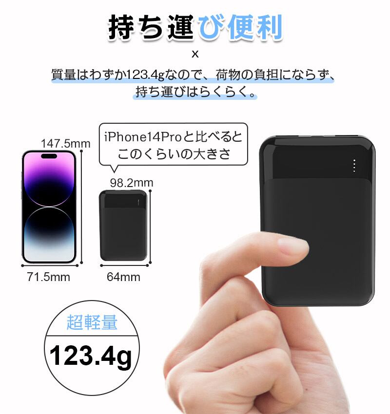 従来の充電器より小型で、重さもわずか123.4gです。簡単にカバンやポケットに収納できるサイズですので、いつでもどこでも気軽に持ち運べ、軽量で海外旅行・出張でも安心できるモバイルバッテリーです。