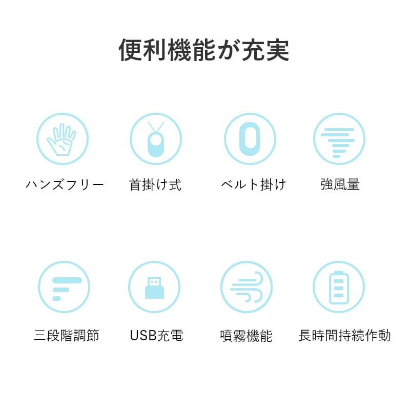 ミスト扇風機 携帯扇風機 冷風機 噴霧機能 首かけ 卓上 腰掛け式 ベルトファン 手持ち 加湿 保湿 ハンディファン ネッククーラー 3段階風量調整 2段階噴霧調整 USB充電式 スタンド機能 ハンズフリー ポータブル ミニファン 小型 コンパクト 大風量 超静音 軽量 持ち運び 熱中症対策 猛暑対策グッズ 祭り 花火大会 スポーツ観戦 アウトドア 90日あんしん保証付き 日本語取扱説明書付き