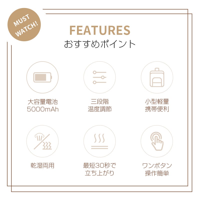【コードレスアイロン】アイロン本体にコードがないため、衣類やアイロン台にコードが引っかかることなく、快適にアイロンがかけられます。電源のない場所でも使用しやすいです!5000mAhの大容量電池、50分間連続使用できます。一回4-6枚衣類使用可能、一人分のアイロンがけには十分です。出張旅行用には、いいと思います。収納ボックスが付いており、コンパクトに片付けられるタイプです。