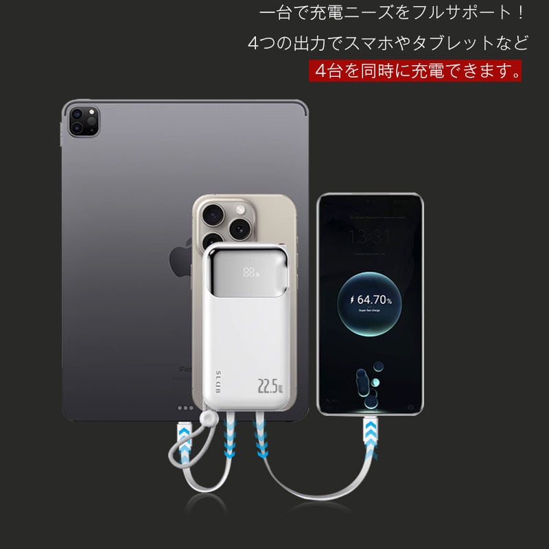 本製品はノマドワークや出張など外で仕事をする際に強い味方となるコンセントプラグ付きUSBアダプタとUSBケーブルとモバイルバッテリーが一つになった便利過ぎる3in1充電アイテムです。iPhone/Type-C出力ケーブルとUSB-A/Type-C出力ポートが付いており、4台の設備の同時充電をサポートします。(*PD 22.5W急速充電とQC3.0急速充電をサポートします。)