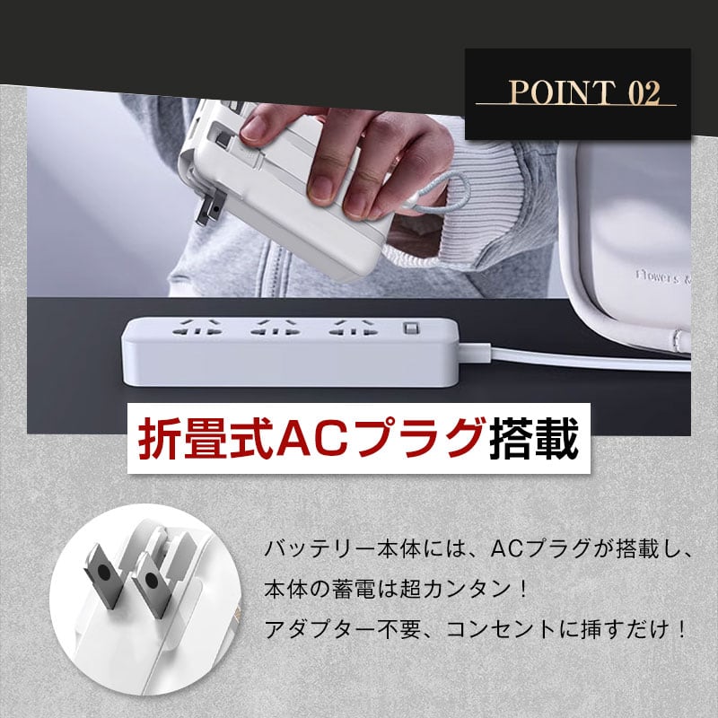 モバイルバッテリー モバ充 バッテリー コンセント一体型 折り畳み式ACプラグ アダプター不要 便利に充電できる アダプターの一体型 ケーブル不要 iPhoneケーブル Type-Cケーブル内蔵 ケーブル一体型 大容量 iPhone対応 10000mah おすすめ iPhone各種 iPad各種 ストラップ付き 持ち運び便利 Android&Type-C各種 充電用 パワーバンク オールインワン iPod AirPods Apple Watch Series SE/7/6/5/4/3/2 小型 軽量 薄型 iPhone充電器 au ドコモ docomo携帯電話 Softbank ソフトバンク スマホ充電 タイプc Ipad充電器 air iPhoneSE アイフォン充電器 アイパッド GALAXY 荒野行動などゲーム時の充電切れを解決 サブバッテリー タフ 悪環境 過酷な環境 スマホ アイホン充電器 スマホ充電 充電 USB-A出力 安全保護機能搭載 安全充電 安心 外出中の充電切れに困らない パススルー機能搭載 地震対策 震災 防災グッズ 防災アイテム 停電対策グッズ 台風 洪水 災害グッズ 災害用 災害用品 モバイル充電器 ポータブル 防災用品 防災対策 車中泊グッズ アンドロイド android apple watch ゲーム機 Switch充電 4台同時急速充電 機内持ち込み可能 搭乗基準に適する 出張 旅行 アンドロイド イヤホン充電器 スマートウォッチ 黒 ブラック 白 ホワイト スマートフォン 節電 PSE認証 アウトドア キャンプ 春の行楽 遠足 花見 ピクニック 釣り USB給電式電気製品 携帯用充電器 急速充電器 高速 出力 スマホバッテリー 日用品 小物 便利グッズ 便利アイテム 必需品 オシャレ おしゃれ おすすめ シンプル プレゼント 通勤 通学 贈り物 誕生日 記念日 クリスマス クリスマスプレゼント 母の日 父の日 敬老の日 勤労感謝の日 バレンタインデー ホワイトデー お返し 入学祝い 卒業祝い 卒業記念品 就職祝い 全国一律送料無料 90日安心保証付き