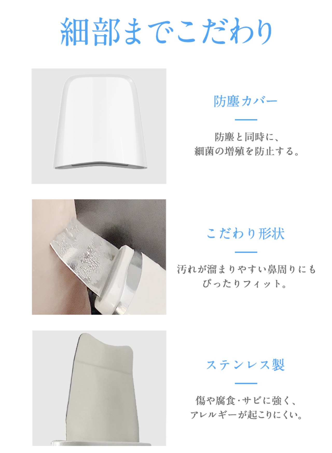 【肌のザラザラ、ぶつぶつを解消する】ウォーターピーリングとは、水と超音波の振動により、毛穴汚れや古い角質を除去するもの。気になる部分に当てることで、毛穴の黒ずみや古い角質による肌のくすみなどを目立ちにくくする効果が期待できます。振動でミスト状にした水のみで汚れなどを弾き飛ばすので、正しく使えばピーリング用の薬剤を使うよりも肌にやさしくケアすることが可能です。美肌を目指すためにも、週数回の特別ケアとして取り入れてみましょう。