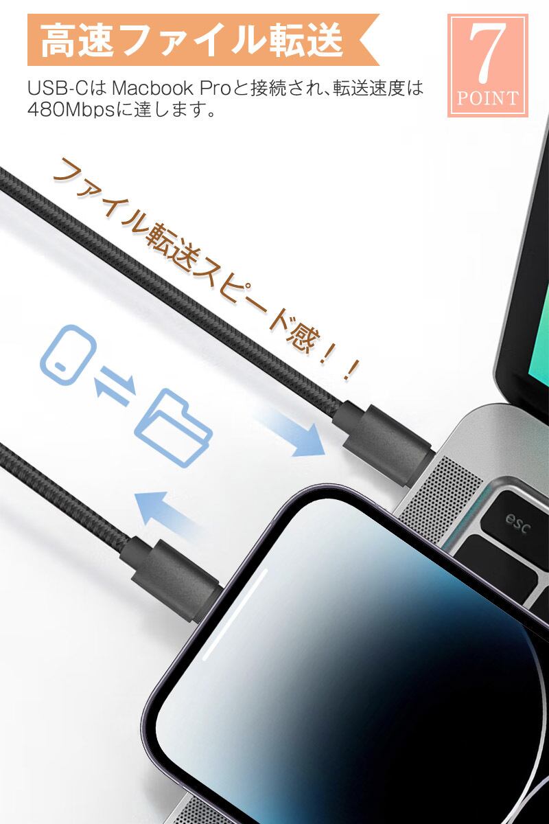 Power Delivery対応のUSB-C急速充電器と一緒に使用することで、iPhone 14/iPhone 14 Plus/iPhone 14 Pro/iPhone 14 Pro Maxを含む最新のiPhoneへPD急速充電可能です。また、USB 2.0基準で最大480Mbpsのデータ転送を対応します。