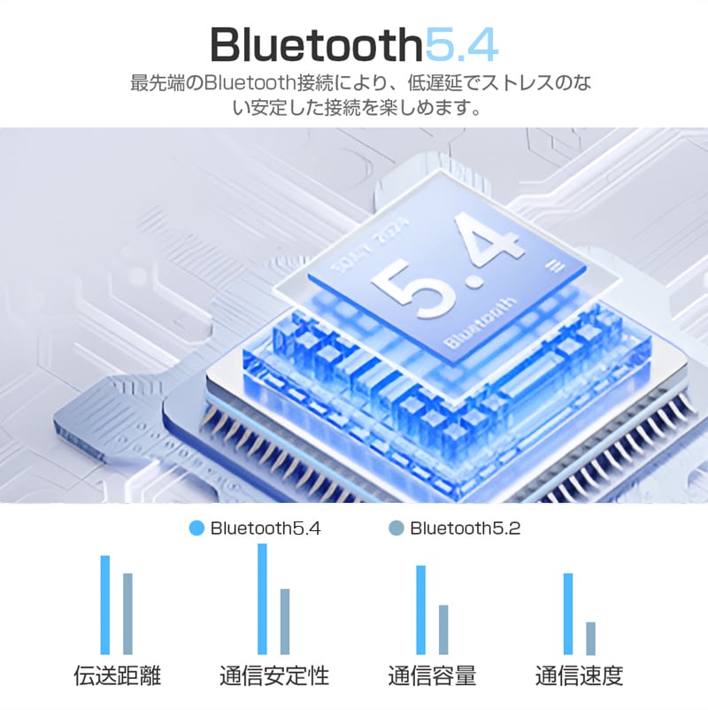 最先端の無線通信技術と最新知能チップを採用しており、従来バージョンより更に高速データ伝送でき、音の途切れ、遅延などの問題を改善し、接続安定性を高めます。自動ペアリング機能が付きます、簡単接続可能です。2度目以降の使用は、ケースからイヤホンを取り出すだけで自動的にペアリング設定済みのデバイスと再接続できます。