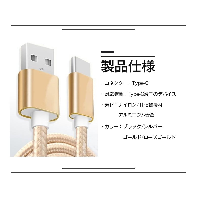 USB Type-Cポートを持つ端末とパソコンを接続してデータ転送をしたり、USB充電器と接続して端末の充電をしたりするときに使用するケーブルです。