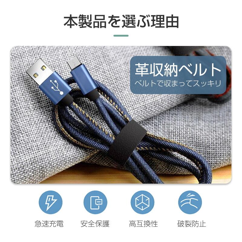 micro USBケーブル Android用 マイクロUSB 2m 急速充電ケーブル デニム生地 収納ベルト付き モバイルバッテリー スマホ充電器 Xperia Galaxy AQUOS | meisei-shop