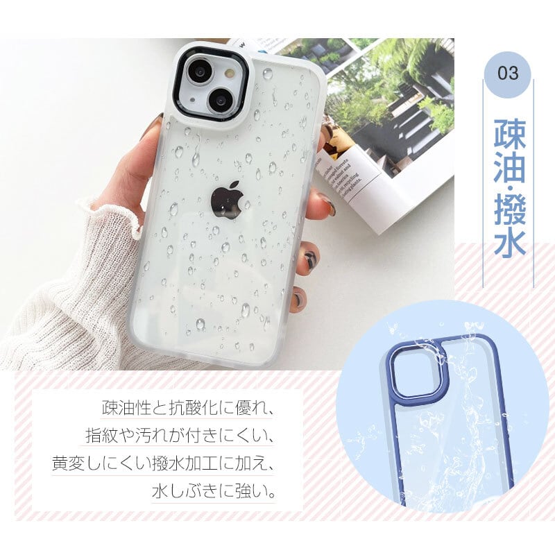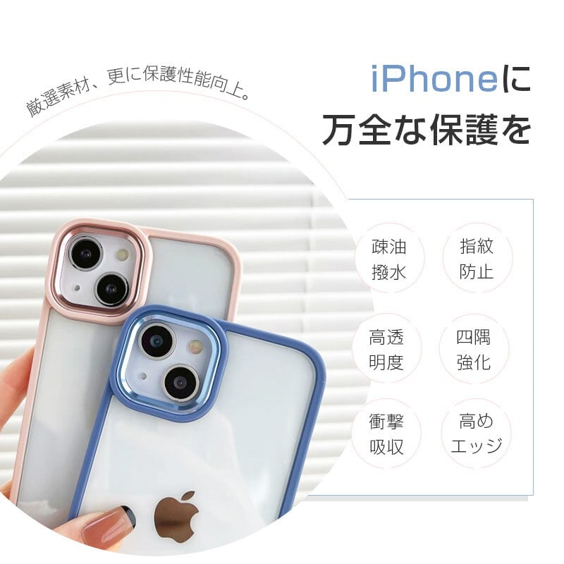 高透過性の高いポリカーボネートと柔軟性に優れたシリコンの2つの素材で落下の衝撃などからiPhoneをしっかり保護します。背面は超クリアであり、iPhone本来の美しさをそのまま表現します。また、操作ボタンとカメラ周りにはアルミ合金素材を使用し、金属のツヤ感で高級感を演出します。