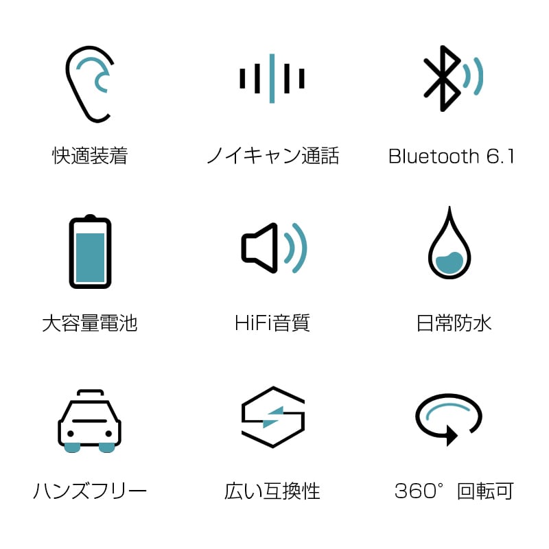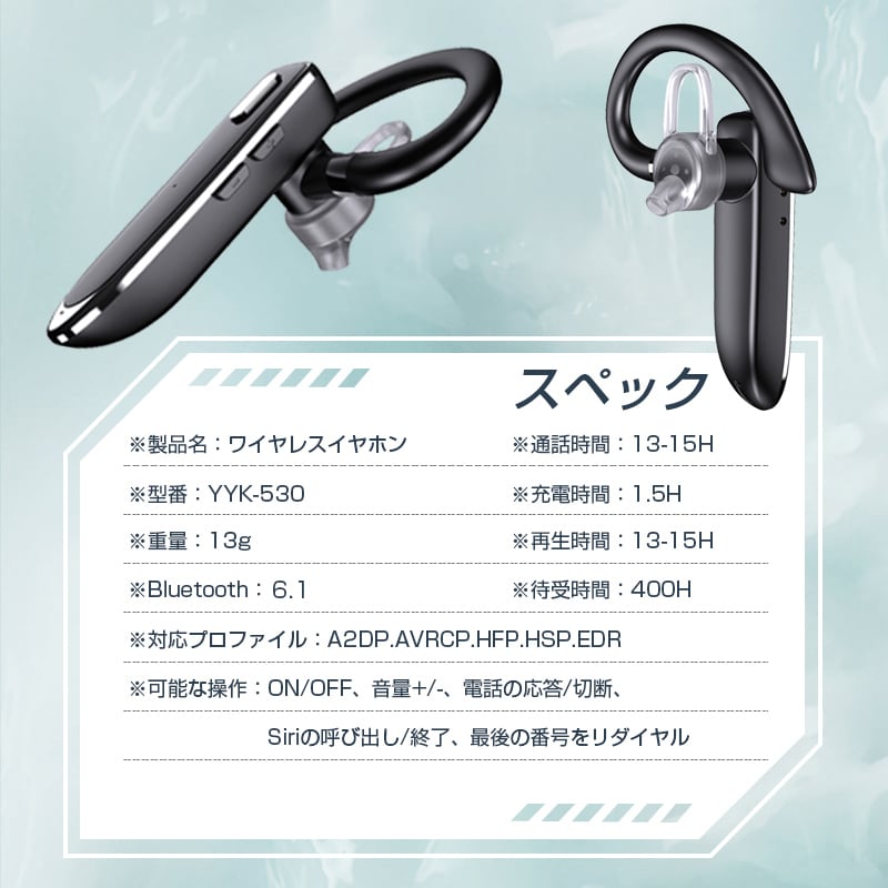 ワイヤレスイヤホン Bluetooth6.1 マイク内蔵 クリア通話 耳掛け式 180°回転 両耳兼用 高音質 超軽量 運動用 テレワーク 防水防滴仕様 スポーツ向け 人間工学設計 快適装着 幅広い互換性(iPhone & Android) 120mAh大容量バッテリー搭載 日本語取扱説明書付き