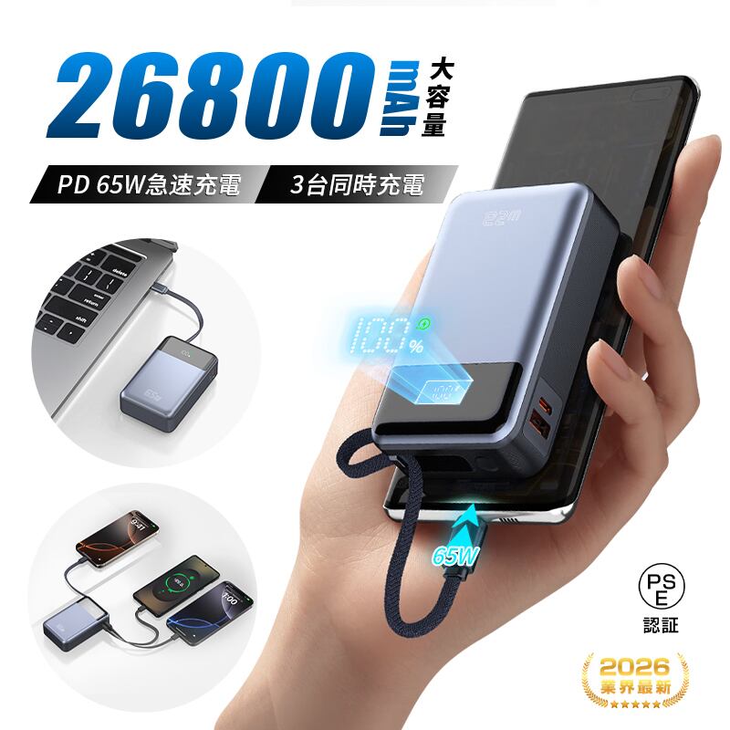2026年新開発 モバイルバッテリー 26800mAh 99.16Wh 急速充電 大容量 残量表示 3台同時充電 ケーブル内蔵 パワーバンク 軽量 超小型 Type-C出入力 LCD残量表示 USBポート PD/QC3.0対応 幅広く対応 iPhone android 防災アイテム iPhone17シリーズ対応 iPad/Android PD65W iPhone16充電 携帯充電器